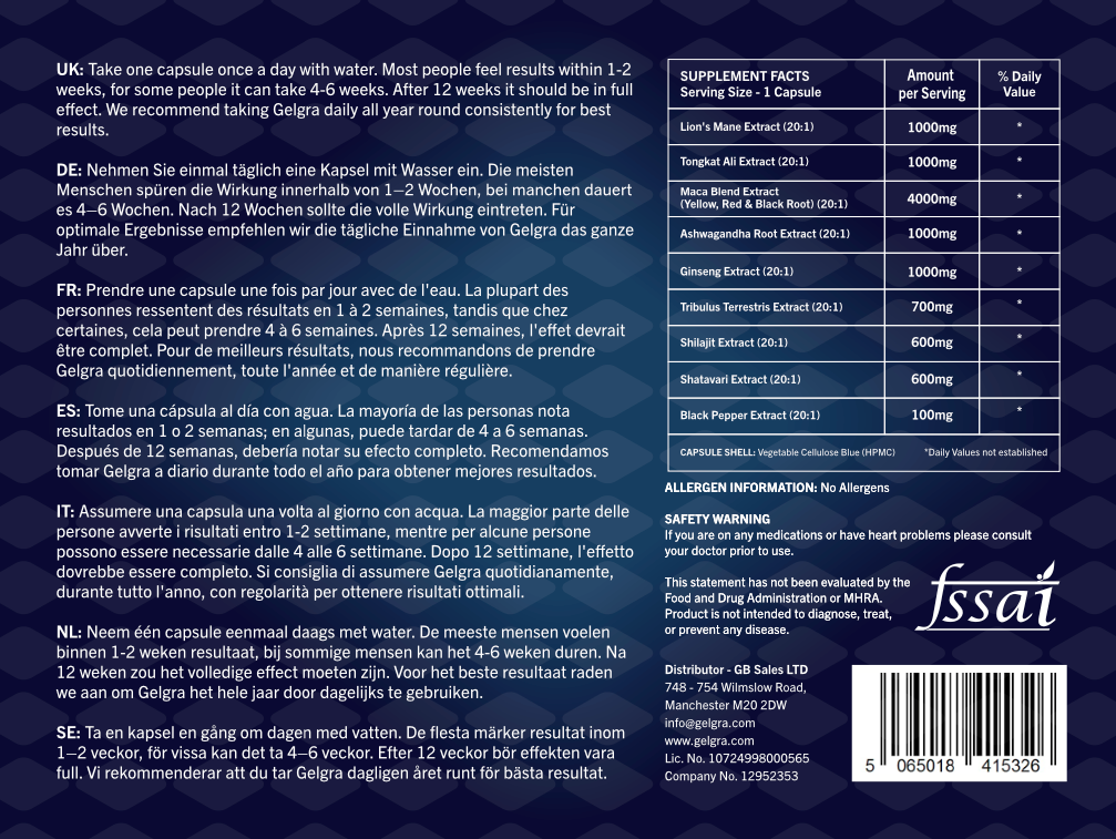 - FEEL ALPHA: Gelgra capsules contain a high dose of Ginseng, Shilijat, Tongkat, Lions Mane, Ashwagandha, Maca + more! All of these ingredients have been proven to help males feel alpha